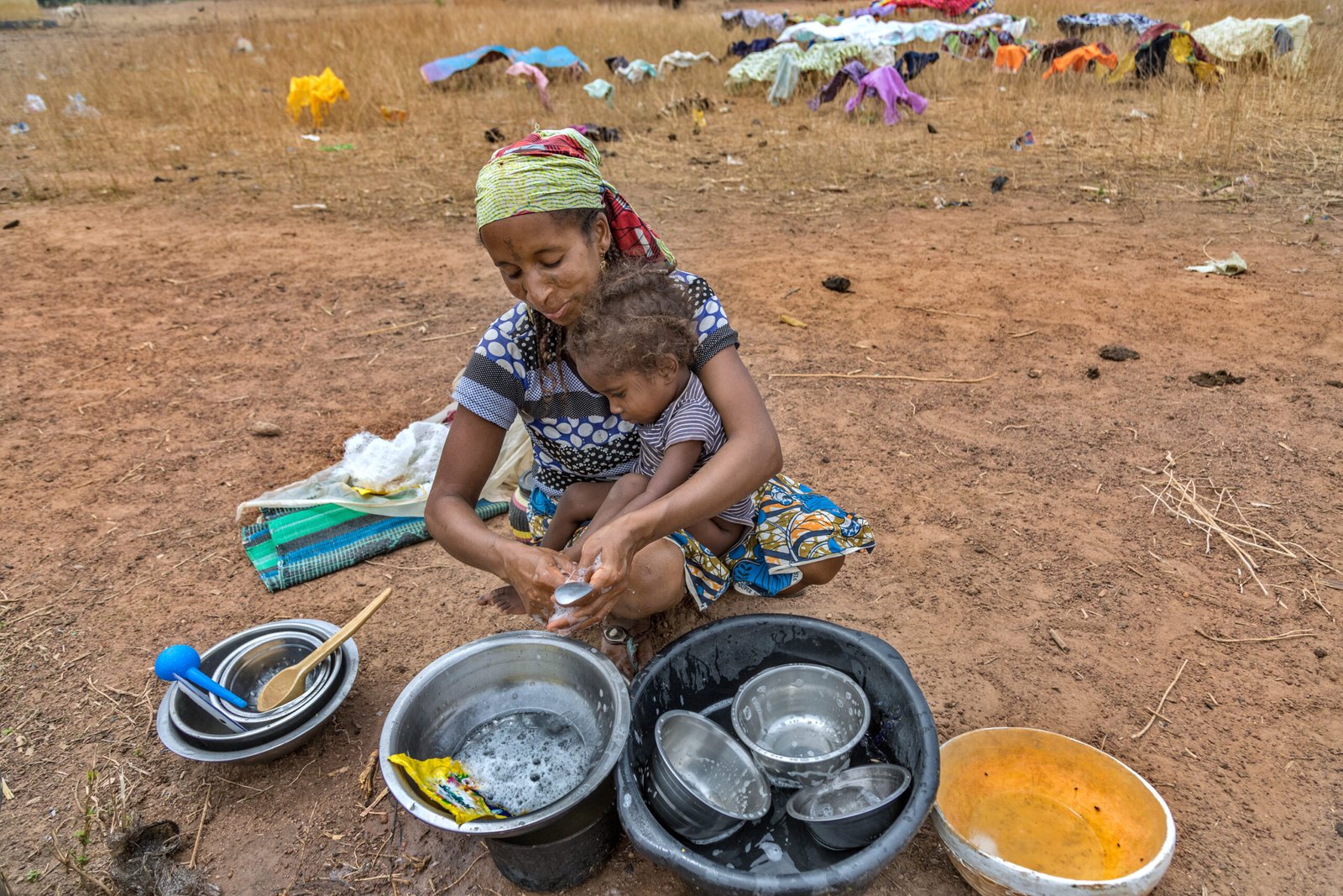 Los residentes de la comunidad Fulani Doka Mai-Jama’a en Kaduna (Nigeria), utilizan agua de un pozo alimentado por energía solar financiado por Rotary. 12 de abril de 2019.