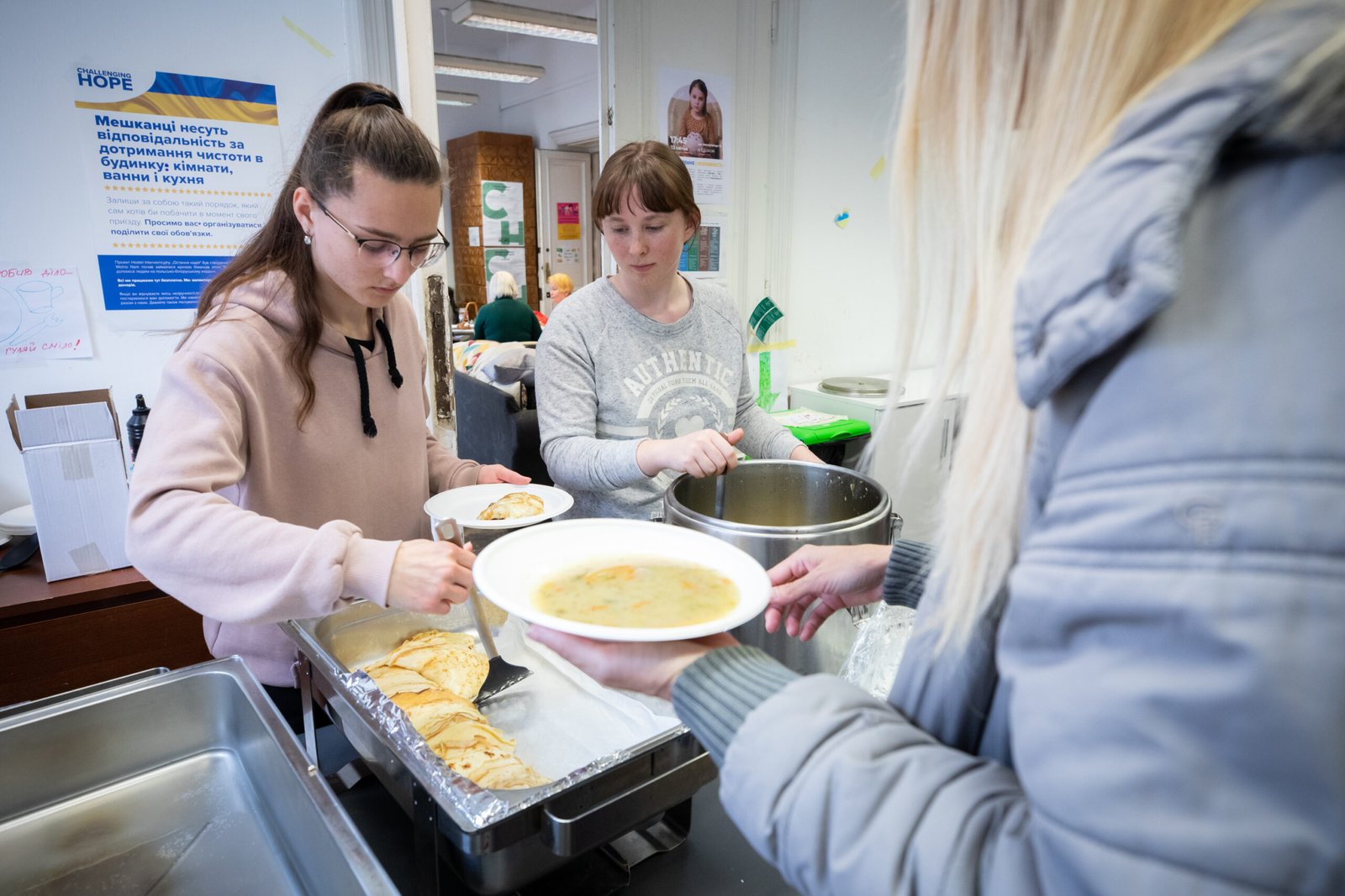 Socios del Club Rotario de Cracovia Wyspianski (Polonia) trabajan con la organización sin fines de lucro Challenging Hope en el Intervention House for Refugees, refugio para personas desplazadas por el conflicto en Ucrania.