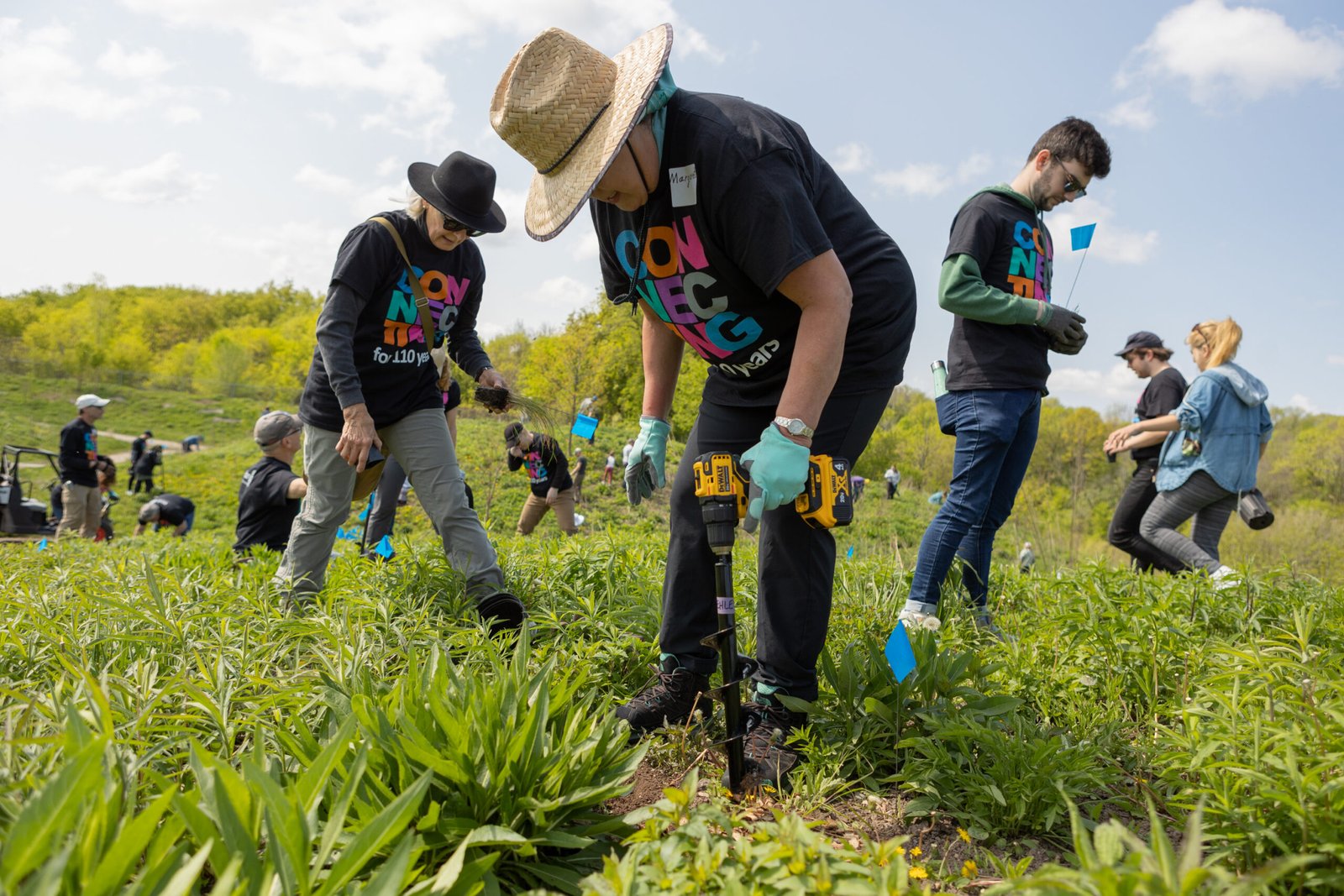 Socios del Club Rotario de Milwaukee, Wisconsin (EE. UU.) y otros voluntarios plantan hierbas de las praderas a lo largo del río Milwaukee.